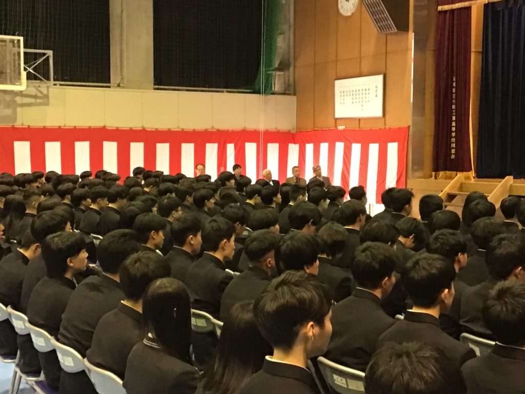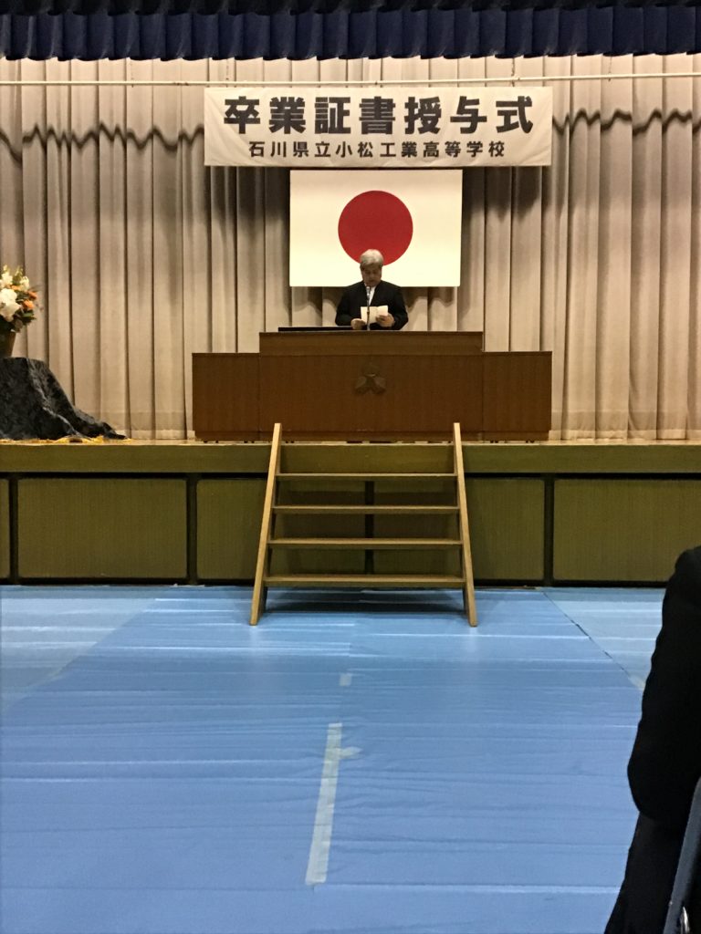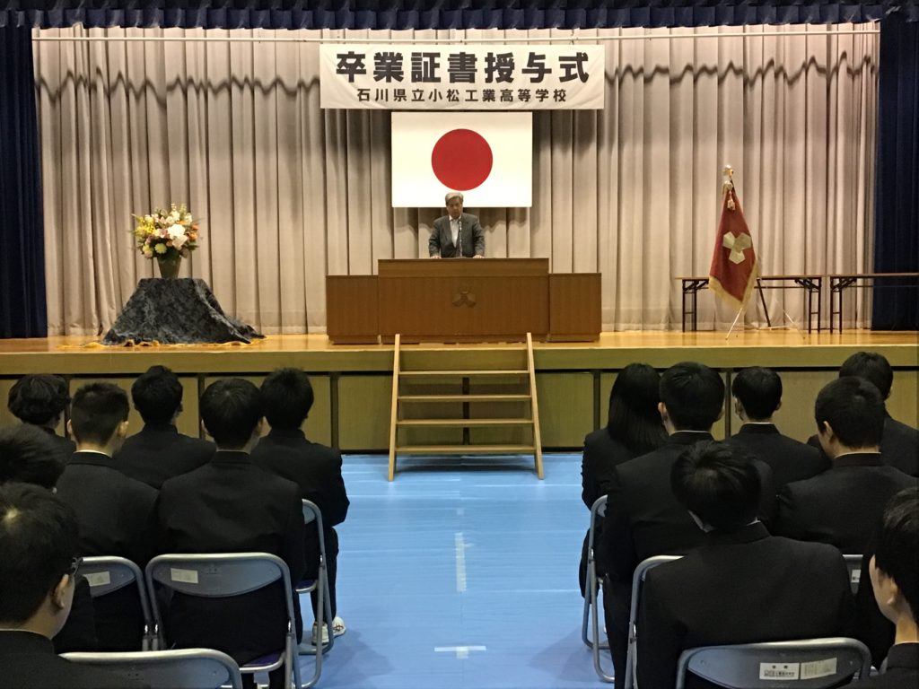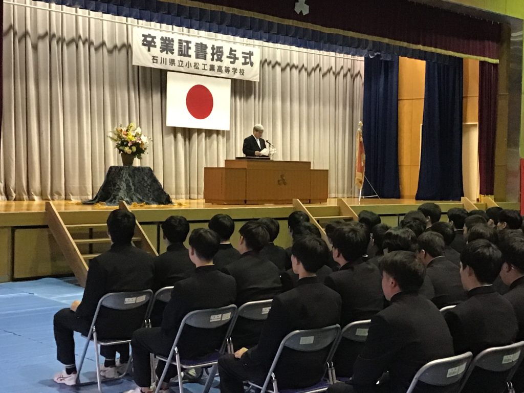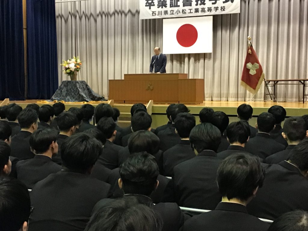 3月3日(火)には石川県立小松工業高等学校 第61回卒業証書授与式が挙行され、山崎同窓会長、岡本庶務、沢田会計と早戸関東支部長、山次中京支部総務幹事、岡田関西副支部長(関西)が臨席し、卒業生204名が卒業しました。